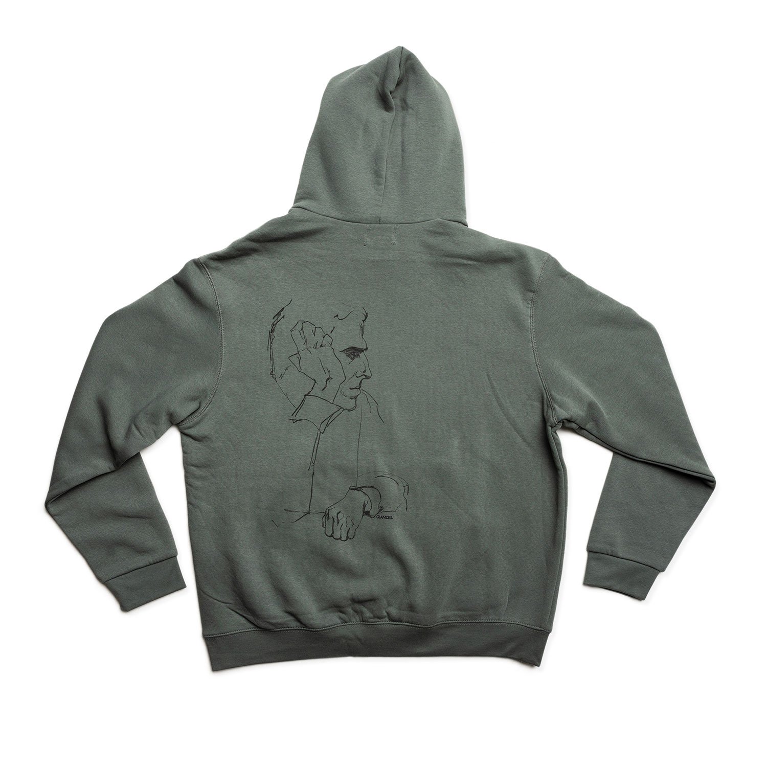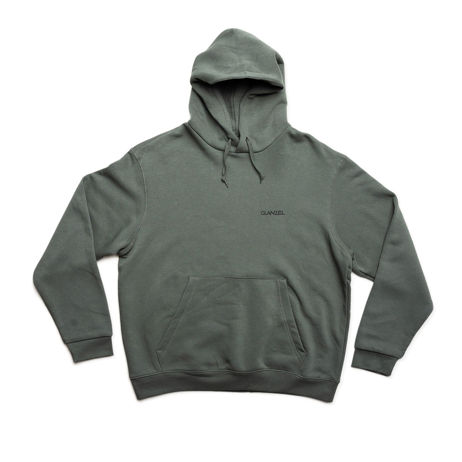 DUSKY GREEN CUSTOM KNIT FLEECE PULLOVER HOOD WITH EXTENDED FRONT POUCH POCKET AND FRONT AND BACK PRINT.